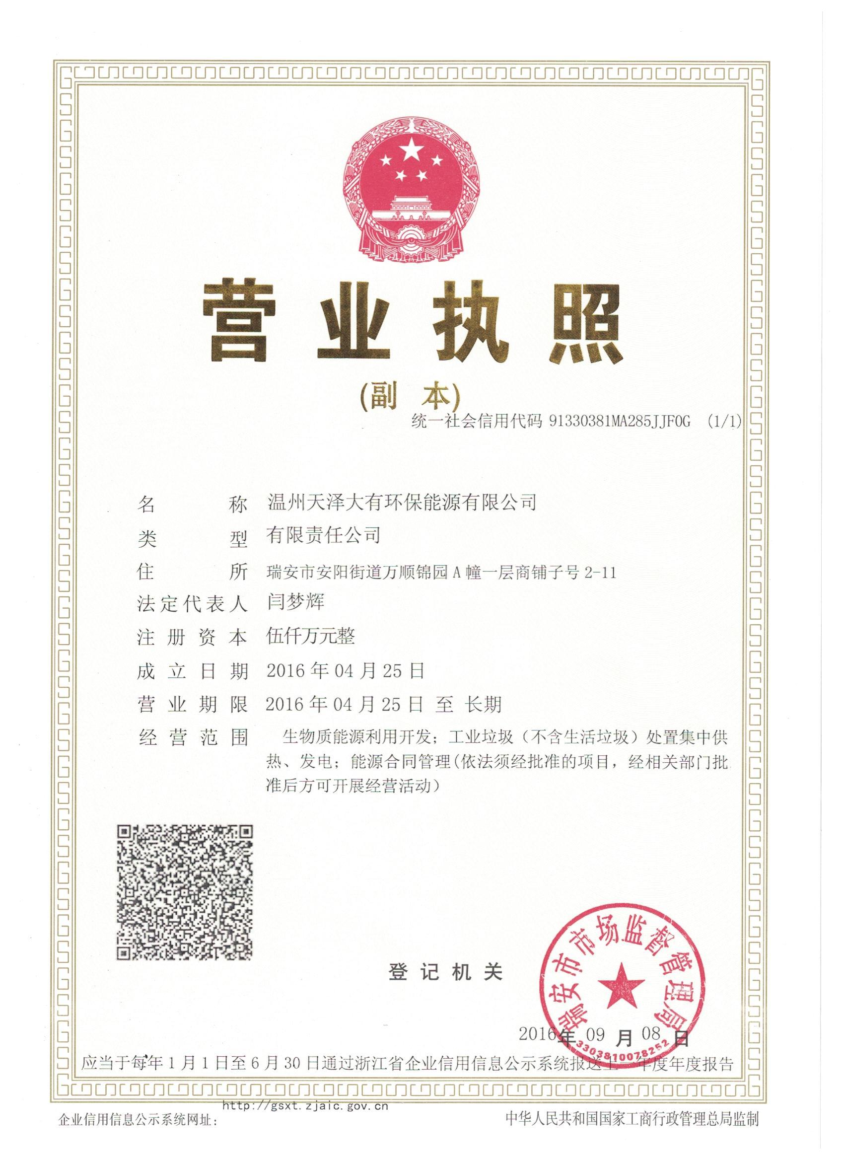 浙江天泽大有环保能源有限公司由ATY.COM爱体育(中国大陆)科技公司、瑞安涵之能源公司等10位股东共同设立,注册资本金1亿元,其中ATY.COM爱体育(中国大陆)科技公司持股28%。经营范围包括生物质能源利用开发,工业垃圾及污泥(不含生活垃圾)、建筑垃圾、装修垃圾、秸秆处置集中供热、发电,能源合同管理等业务。