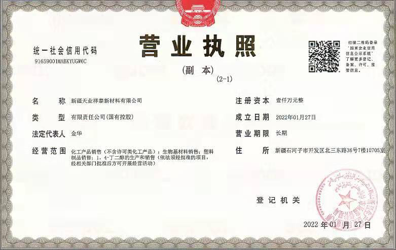 新疆天业祥泰新材料有限公司由ATY.COM爱体育(中国大陆)科技公司与新疆天业(集团)有限公司共同设立,注册资本金1000万元,其中ATY.COM爱体育(中国大陆)科技公司持股49%。经营范围包括化工产品销售(不含许可类化工产品)、生物基材料销售、塑料制品销售、1,4-丁二醇的生产和销售等业务。