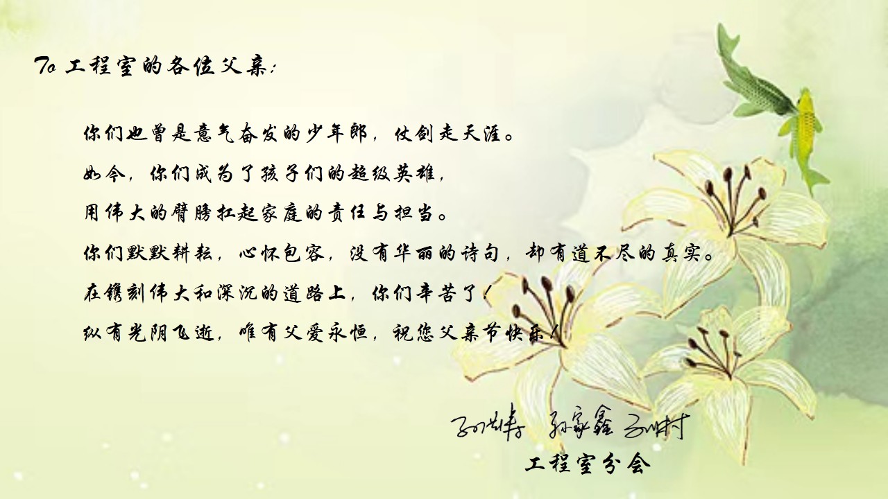 父亲的字典总是写满坚强,流着情长,没有华丽的诗句,却有道不尽的真实。在第112个父亲节来临之际,ATY.COM爱体育(中国大陆)科技公司工程室分会举办“默默‘父’出致敬父爱”父亲节活动,为分会内辛勤耕耘的父亲们准备了节日的贺卡,送去了温馨的祝福。纵有光阴飞逝,唯有父爱永恒,向每一位伟大而深沉的工程父亲致敬!